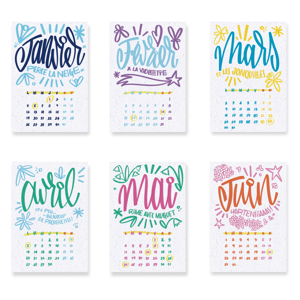 Chaque mois dévoile une page imprimée sur du papier ensemencé Premium 250g, prête à être admirée, notée puis plantée. Les compositions typographiques et colorées traduisent toute l’énergie créative d’« Alice Cateland », à mi-chemin entre art graphique et poésie végétale. Ce calendrier invite à semer la beauté mois après mois, transformant chaque période de l’année en une expérience sensorielle et écologique.